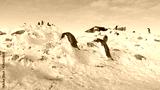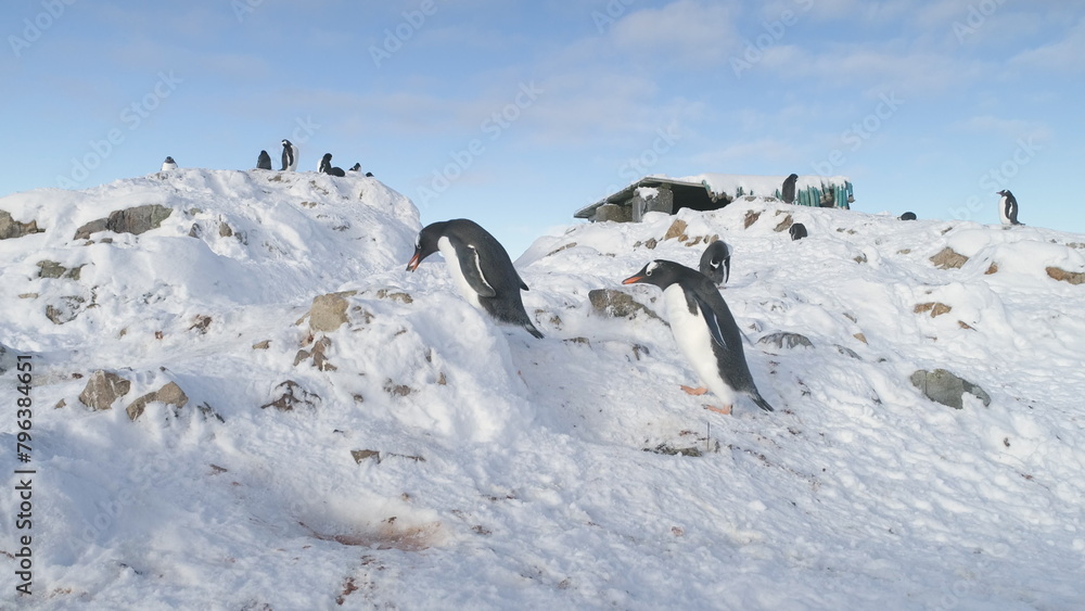 Two Funny Penguins Steal Pebbles from Each Other s Nest. Gentoo Builds Nests and Hatches Eggs. Cute South Bird Looks at Stone to Build Nest. Family Wild Life Scenery.
