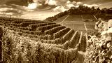 View of hills and vineyards surrounding Barolo in the Langhe region. Cuneo Province, Piedmont, Italy.