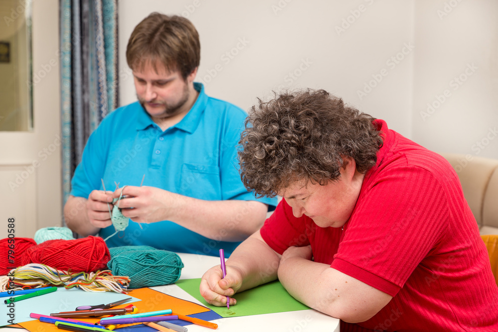 Geistig behinderte Frau mit Betreuer am Basteln