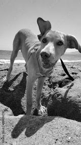 cute puppy playing on the beach on summer vacation, ocean shore behind him