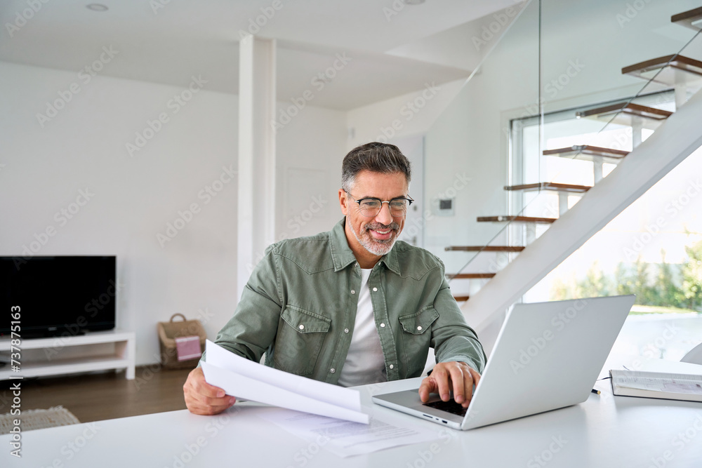 Happy busy mature business woman middle aged female hr manager executive having hybrid office meeting or online job interview by video digital conference call looking on laptop. Vertical.