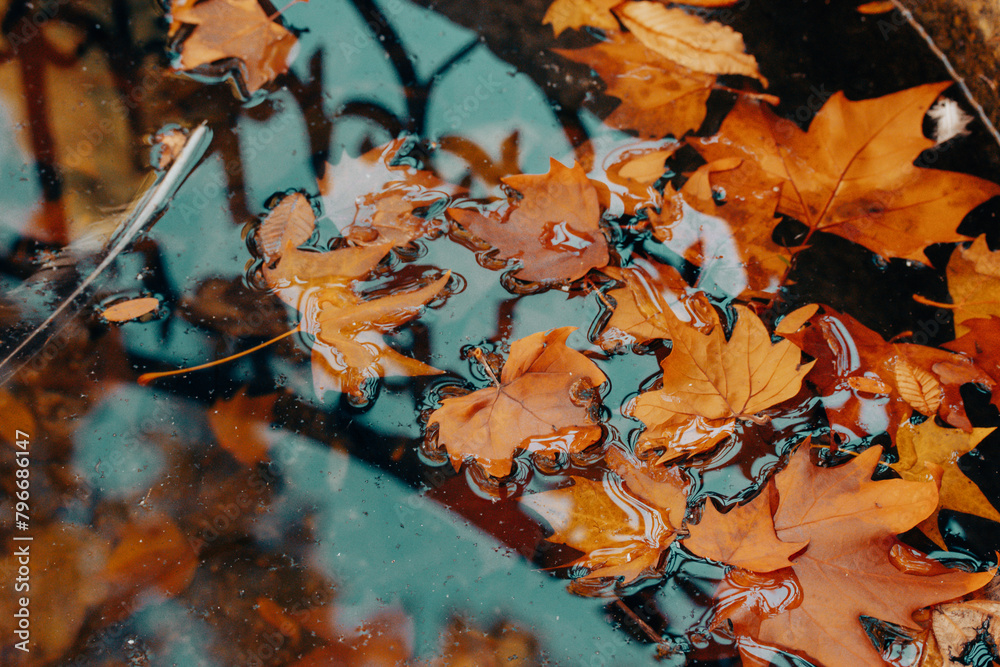 Dry brown maple fallen leaves on a surface of blue water in a calm pond in a fall park, forest. Macro nature. Golden wet leaves. Reflections of a bridge railing on a water. Cinematic nature photo.