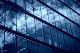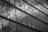 Modern office building glass facade, sky reflection in windows. Skyscrapers urban skyline. Architectural details. High rise estate black and white pic