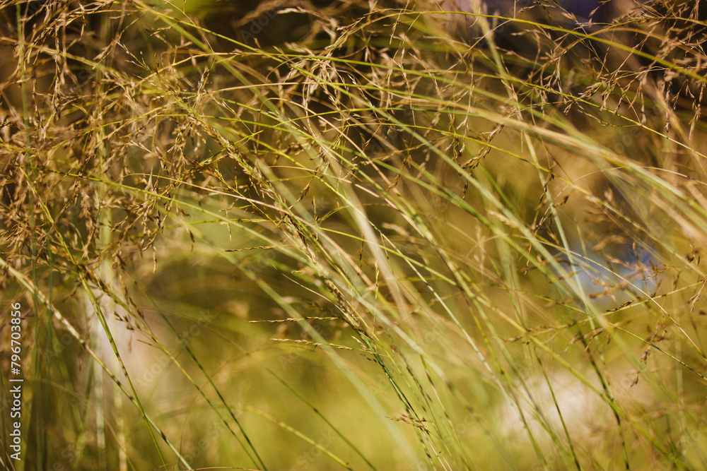 Green grass on a natural background. Plant stem on a blurred backgdrop. Forest and meadow plants on a wind. Tenderness concept. A delicate wild weat on a lawn in a sunshine light. Summertime.