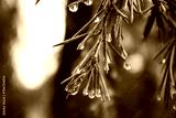 Evergreen conifers pine spruce tree branch long needles with drops of dew, rain. Rainy weather in an autumn forest, park, woods. Trees for the production of coniferous oil. Dark green natural backdrop