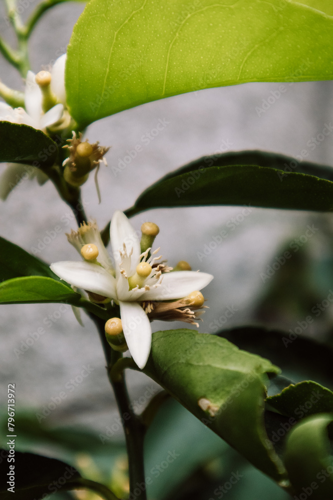 White orange blossom - a snow-white flowers of the Pomeranian tree in the Citrus family. Orange blossom trees. Inflorescence with fragrant petals. Lemon, grapefruit bloom among green leaves wallpaper.