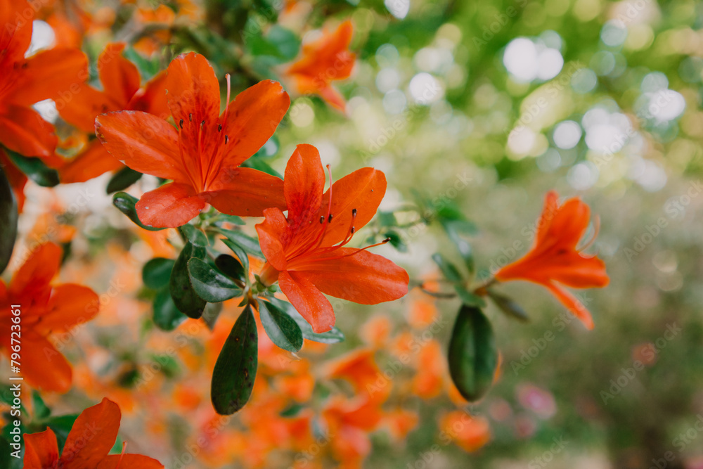 Large red-pink flower buds on a blooming shrub in a spring botanical garden. A pink rododendron in full bloom in springtime. Branch of blooming tree.