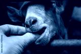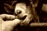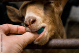 A little reddish brown sheep sucks the finger of a woman's hand with a green manicure. Human contact with farm animals. Animal cute portrait. A muzzle of a goat in female hand close up. Livestock pets