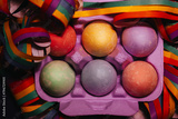 Collection of beautifully painted Easter eggs nestled in a violet box flatly. Egg decorating. LGBT gay vibrant colors greeting card. Festive wallpaper