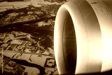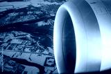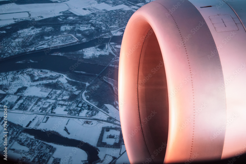 White airplane turbine close-up on a background of a snow-covered landscape. View of the ground, land from a top down. Travel by airplane airliner in winter. Flight abroad in winter cold day.