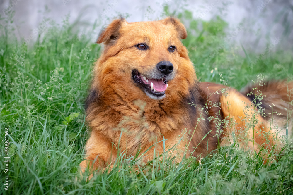 The brown fluffy dog with its mouth open is resting in the garden on the grass