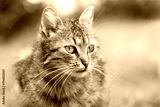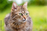 Brown cat with a attentive gaze in the garden against a blurred background, a cat portrait