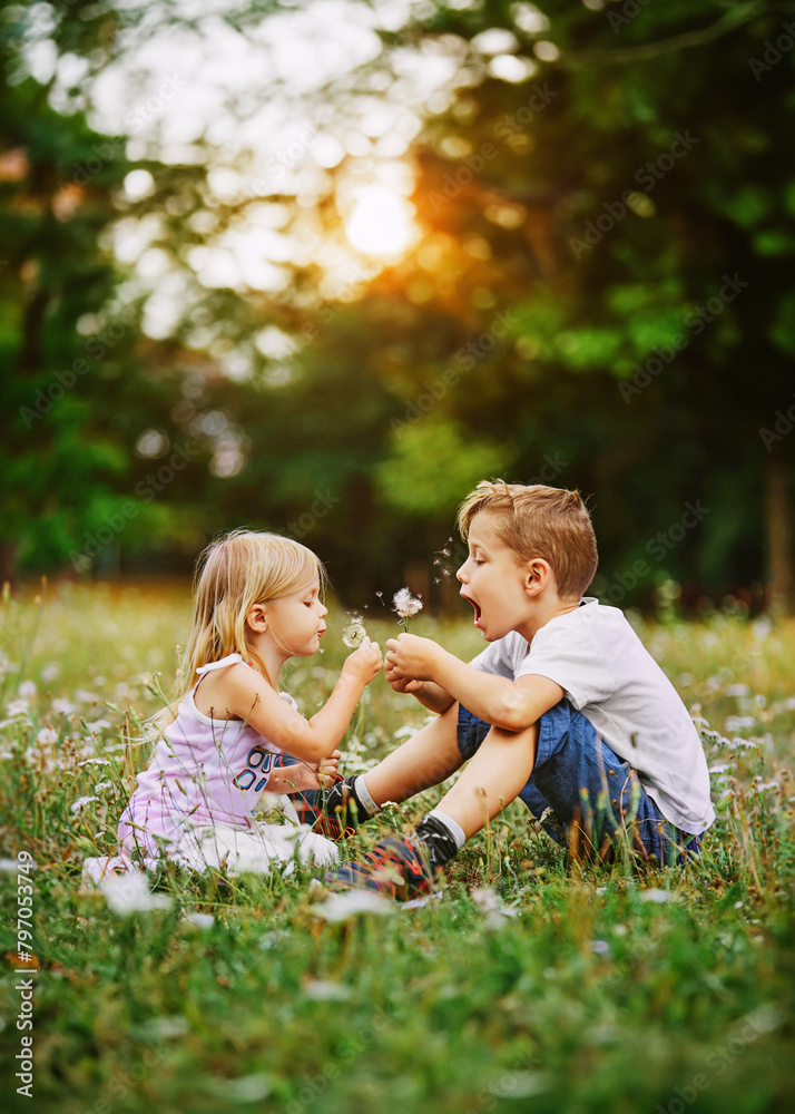 Happy children play outdoor with the dandelions. Happy healthy beautiful children with blowball, having fun. Poster.