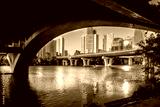 Beneath the North Lamar Bridge in Austin, Texas, the tranquil waters of Lady Bird Lake mirror the golden hues of the cityscape, creating a beautiful reflection on a summer day.