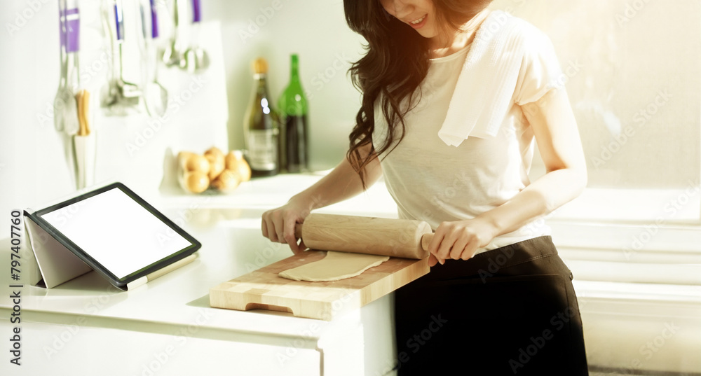 woman do bakery with online learning about bakery receipt program to practice from streaming website or cooking online course