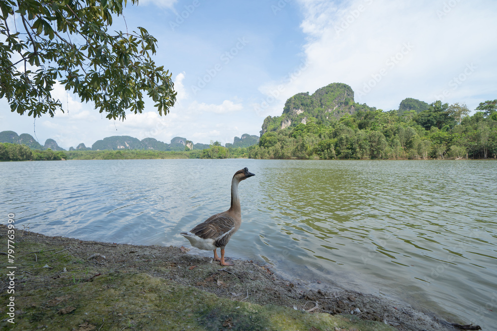 A duck at tropical green forest trees at sunset with Andaman sea in Phang Nga Bay in summer, Thailand in travel trip and holidays vacation. Animal