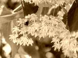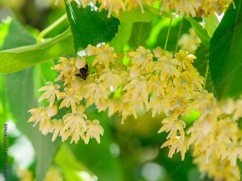 Bee between linden flowers and abundance of foliage leaves. Lime tree or tilia tree in blossom. Summer nature background.