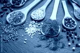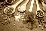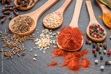 Various types of spices on wooden spoons on a gray stone table.