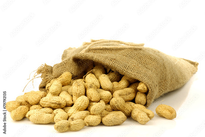 burlap bag with roasted peanuts on a white background