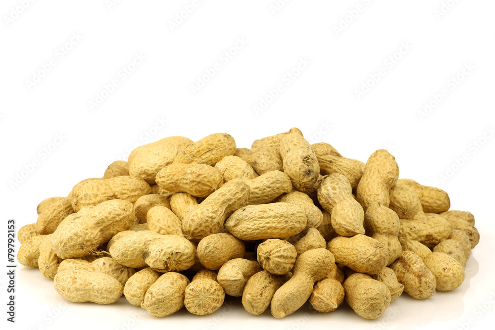 bunch of roasted peanuts on a white background