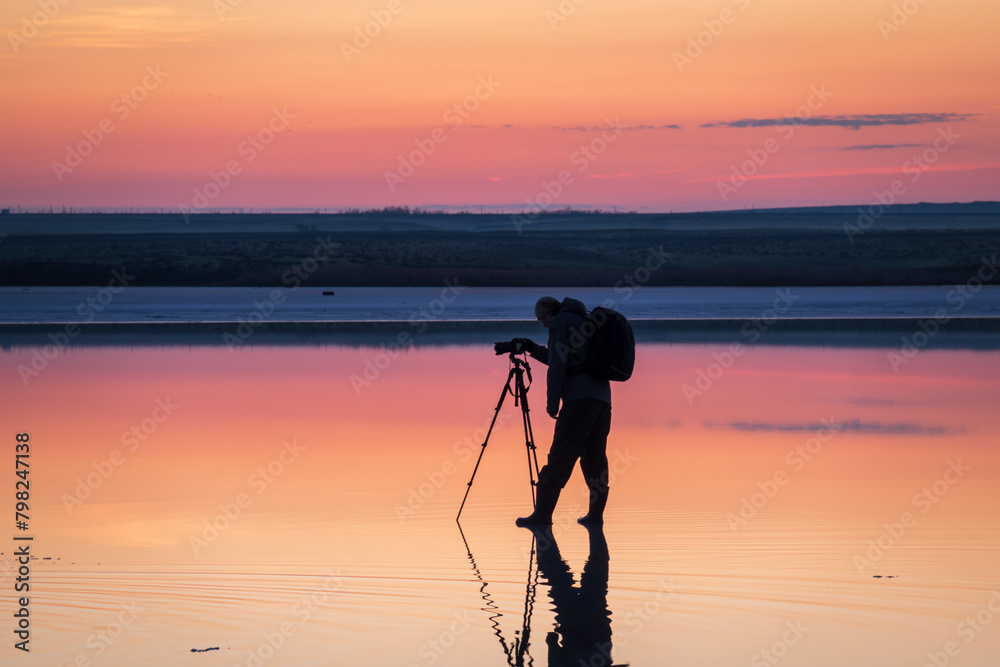 Serene scene with a photographer silhouetted against a vibrant sunset, standing in calm waters while setting up a camera on a tripod.