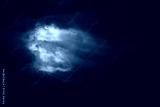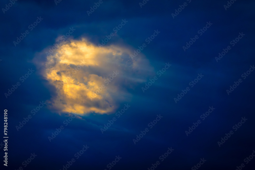 Striking image capturing a single cloud, brightly lit by sunlight against a dark twilight sky. This scene evokes feelings of hope and isolation.