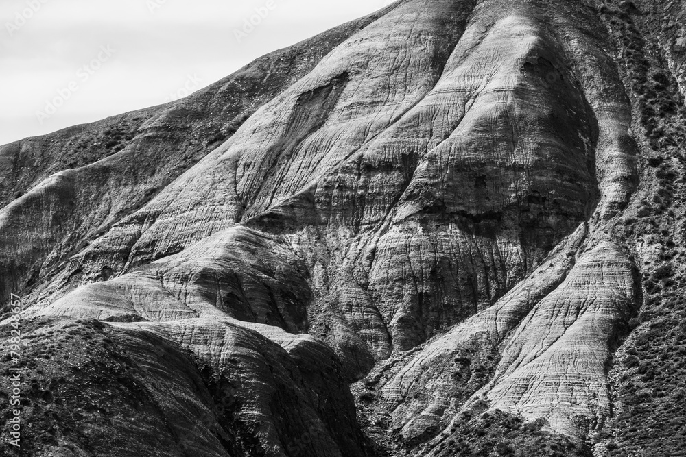Stunning black and white photograph capturing the intricate, textured layers of a mountain landscape, showcasing natural beauty and geological formations.