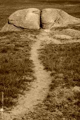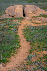 Scenic view of a dirt trail winding its way towards a large, split rock set in a vibrant green meadow under a clear blue sky.