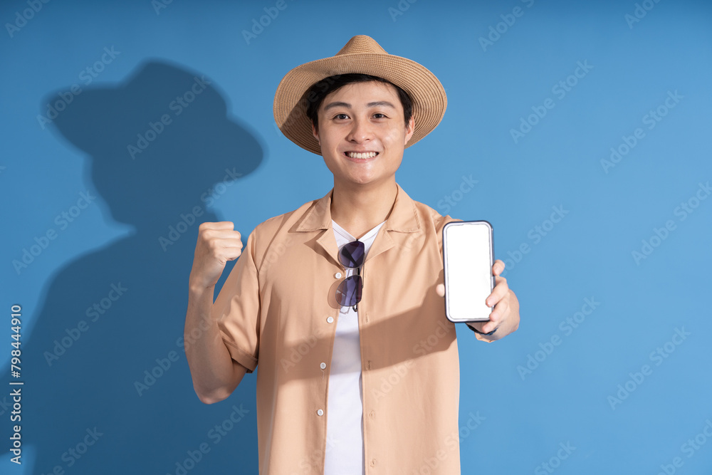 Portrait of Asian man posing on blue background, traveling in summer