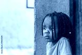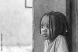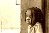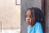 village single african small girl with braids standing in front of the door in the yard outdoors