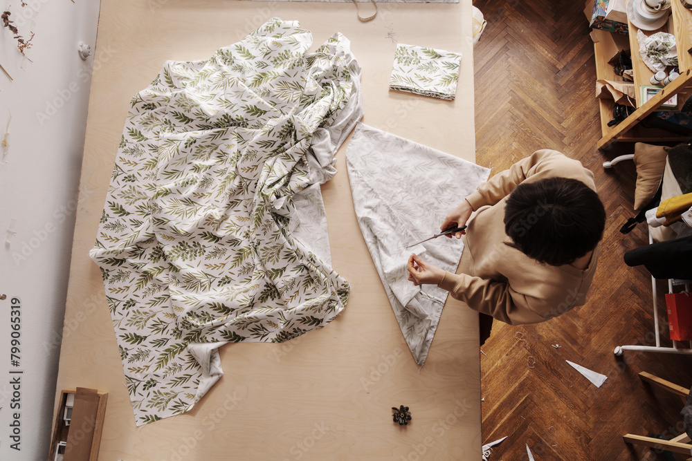 Aerial view of a female tailor cutting fabric in a cozy sewing workshop.