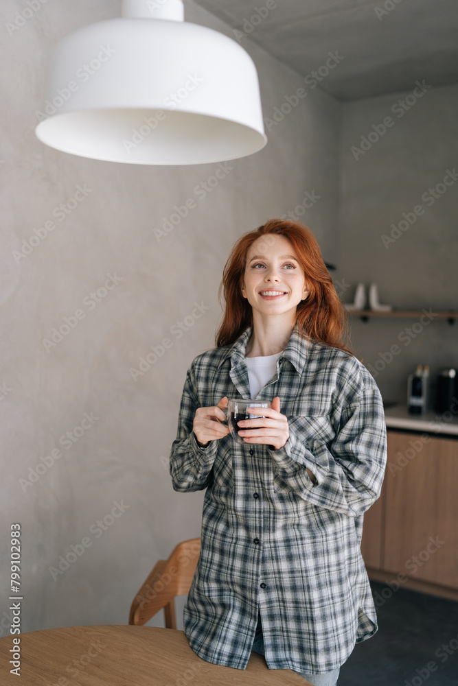 Vertical portrait of smiling woman enjoying holding cup drinking coffee standing in kitchen on sunny morning. Happy smiling female relaxing on caffeine break. Satisfied lady drinking coffee at home