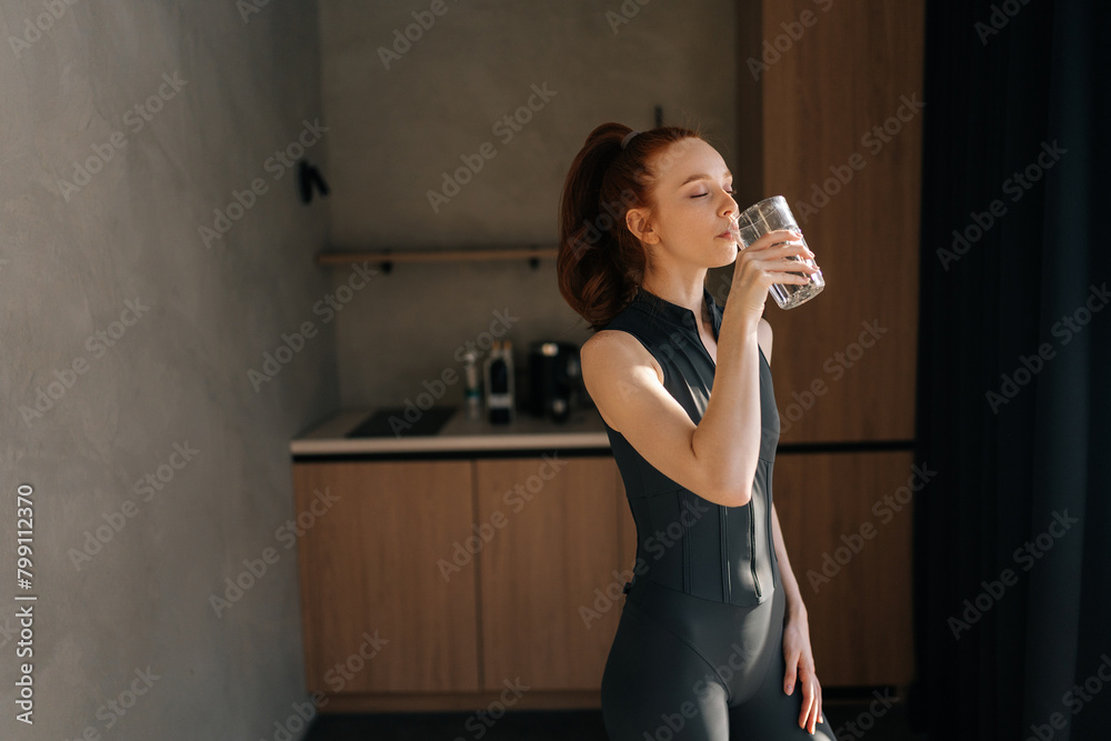 Athletic young woman wearing sportswear standing in home kitchen drinking fresh water after doing workout. Thirsty active sport female takes sips. Dieting, healthy lifestyle, weight loss concept.