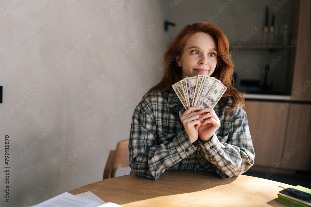 Funny fooling young woman counting money in dollars banknotes sitting in kitchen table at home. Rich happy female holding in hands stack of cash money of success, gain, victory. Concept of investment.