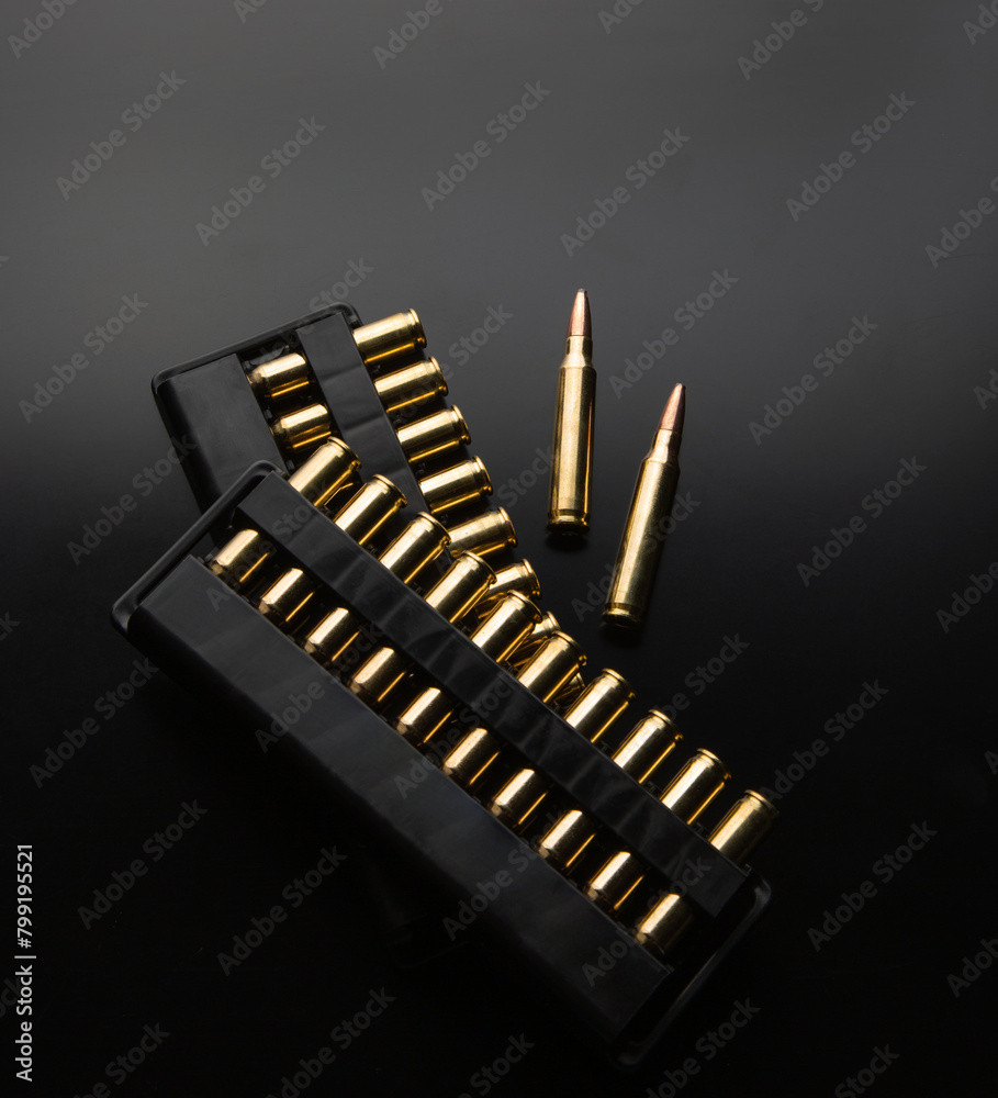 Bullet isolated on black background with reflexion. Rifle bullets close-up on black back. Cartridges for rifle and carbine on a black.
