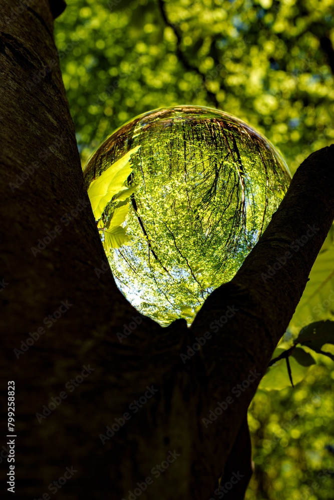 Springtime forest with sun shining through crystal lensball leaves and branches. Nature, forestry, Trees, habitat, environment and sustainability concepts, sustainability picture, stock photo, sunstar