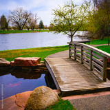 Wooden Bridge over the little pond and stone footpath at Terrace Park Japanese Gardens in Sioux Falls, South Dakota, USA