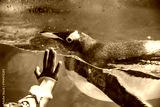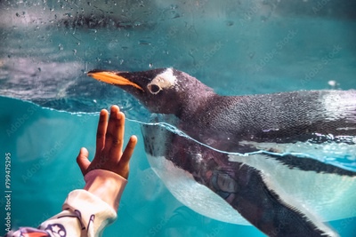 Captive cute Gentoo penguin looking at child while swimming in water tank in an aquarium or zoo. Child's hand can be seen against the water tank glass, trying to touch and welcome the friendly penguin