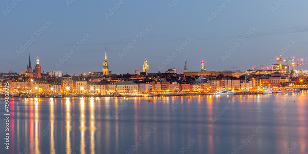 Scenic panoramic view of Gamla Stan, in the Old Town in Stockholm at night, capital of Sweden