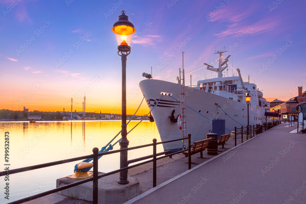 Evening light bathes a ship docked in Stockholm, Sweden, showcasing the tranquil harbor