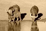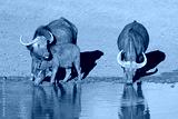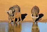 African of Cape buffaloes (Syncerus caffer) drinking at a waterhole, Mokala National Park, South Africa.