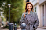 Brunette haired woman wearing tweed coat and walking outdoors in the city street on autumn day