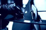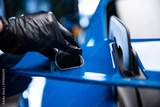 Car cash or car detailing studio worker applying graphene or ceramic coating on blue sport car.