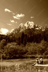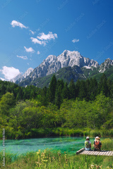 Couple tourists enjoying green nature outdoors. Amazing view on Zelenci (into English means - green) nature reserve and Alps mountains in Slovenia, Europe. People in nature background. Travel concept.