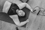 Top view of exhausted overweight Asian woman lying on yoga mat after training in gym. Young chubby woman hard work to lose weight in fitness club. Weight loss workout, healthy lifestyle concept.
