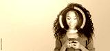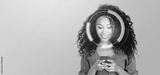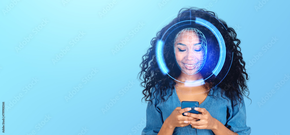 A smiling woman with digital face recognition graphics over her face, holding a phone, on a blue background, depicting cybersecurity concept