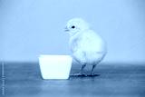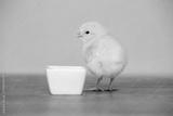 Gros plan d'un jeune poussin tout jaune debout sur une table en bois avec un bol blanc