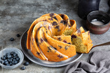 Orange Blueberry Bundt Cake with poppy seed and icing. Homemade bakery. Dark grey background.
