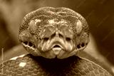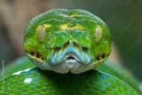 Very closeup front view head of Green Tree Python (Morelia viridis), also known as the Emerald Green Python.