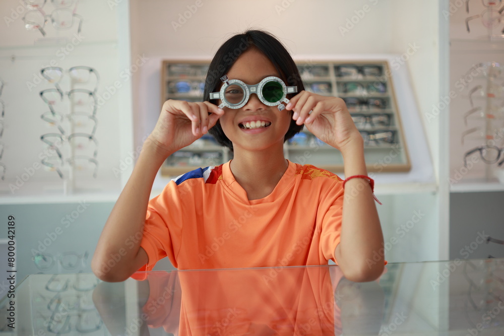 Child wearing eyeglasses for medical eye test in clinic , eye exam, eye test concept, kid eye test